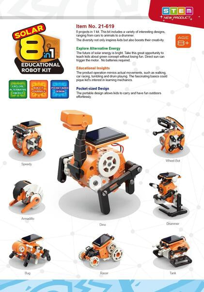 Overall, the 8-in-1 Educational Robot Kit provides a fun and educational way for children to learn about robotics, mechanics, and green energy concepts through hands-on building and play. By engaging in the assembly and operation of the robots, children develop critical thinking skills, problem-solving abilities, and an appreciation for STEM (Science, Technology, Engineering, and Mathematics) subjects.