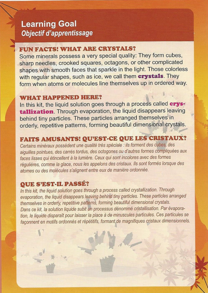 in this kit, the liquid solution go through a process called crystallisation. Through evaporation, the liquid disappears leaving behind tiny particles. these particles arranged themselves in orderly, repetitive patterns, forming beautiful dimensional crystals.