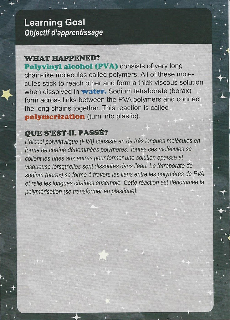 Polyvinyl alcohol ( PVA) Consists of very long chain-like molecules called polymers. all of these molecules stick to reach other and form a thick viscous solution when dissolved in water. Sodium tetraborate ( Borax) form across links between the PVA polymers and connect the long chains together. this reaction is called polymerization ( turn in to plastic).