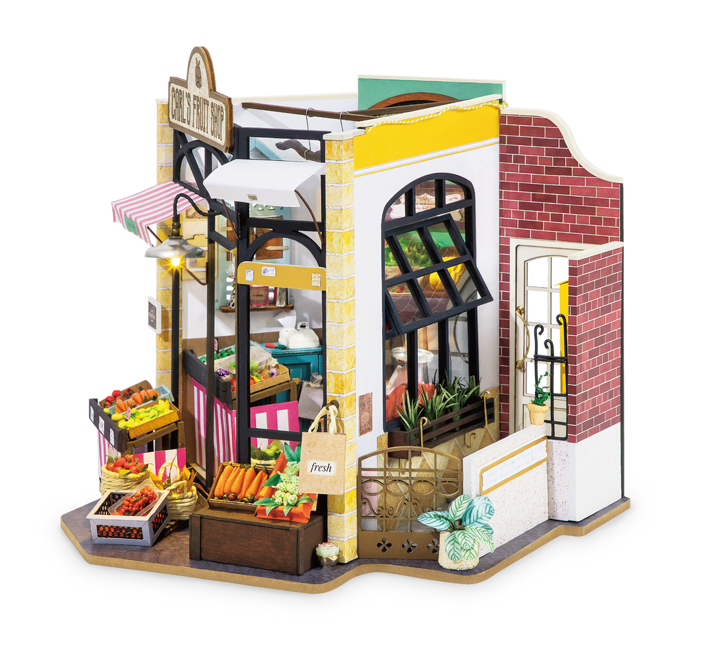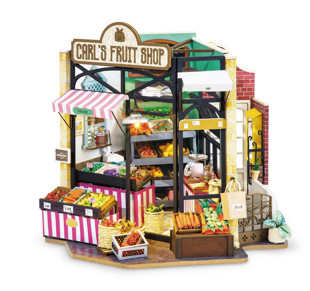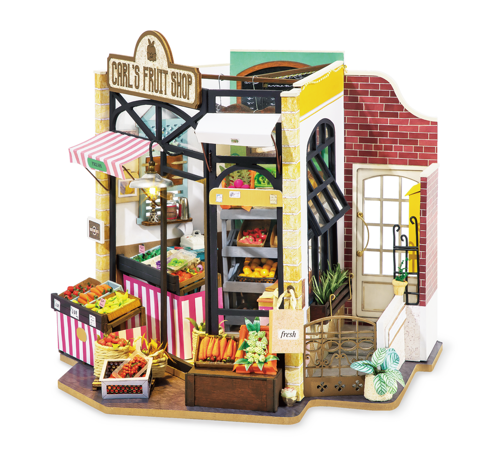 • About: Carl's Fruit Shop Miniature Dollhouse Kit invite you to a peaceful corner of the neighborhood. You can find these hidden gems anywhere, but now you can bring it to life yourself. The do-it-yourself collection is perfectly suitable for beginner to try out a new hobby or veteran seeking new inspirations for their next arts & crafts project.