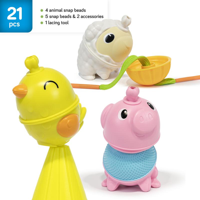 • Barrel of farm animal-themed educational beads (total pieces included)