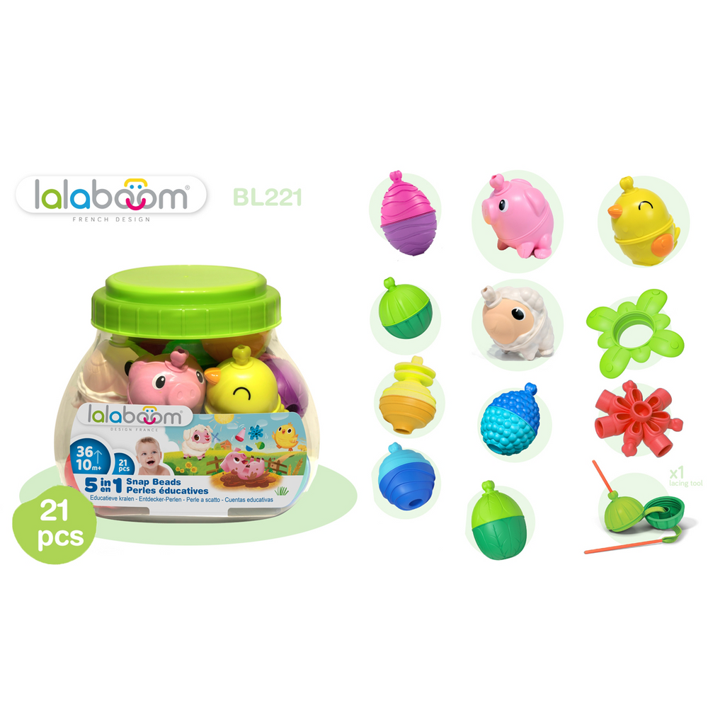 Lalaboom is the only toy that evolves with your child from 10 months to 4 years, supporting every developmental stage. From the discovery of textures and colors to the full development of fine motor and construction skills (clipping, screwing, mixing, inserting, and lacing), this toy grows with your child. Durable, unbreakable, and easy to wash, Lalaboom is dishwasher-safe and features a patented French design. Made from BPA and PVC-free flexible material with a 5 cm diameter, Lalaboom has won over 25 awards from toy and early childhood professionals worldwide, including the Grand Prix du Jouet and the Parents Prize in France.